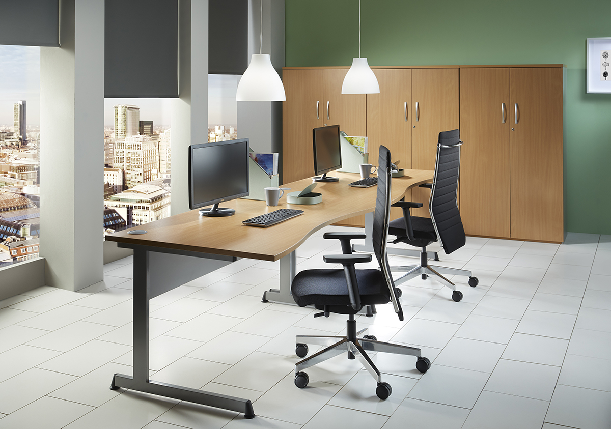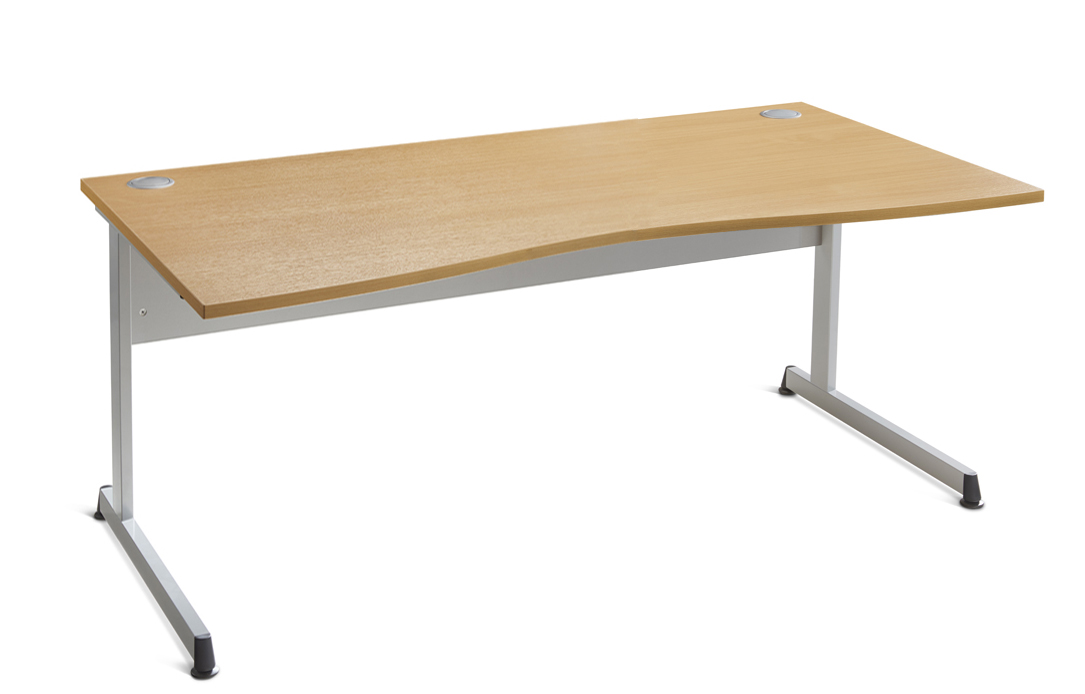 The Media Lite range of double wave desking, cantilever frame finished in Silver (RAL9006). Unique and stylish foot detail with height adjustment glide. 25mm MFC top with matching 2mm ABS edging. Top complete with two cable pods.