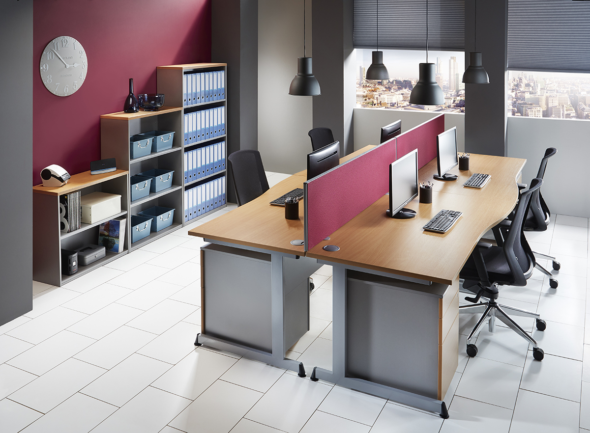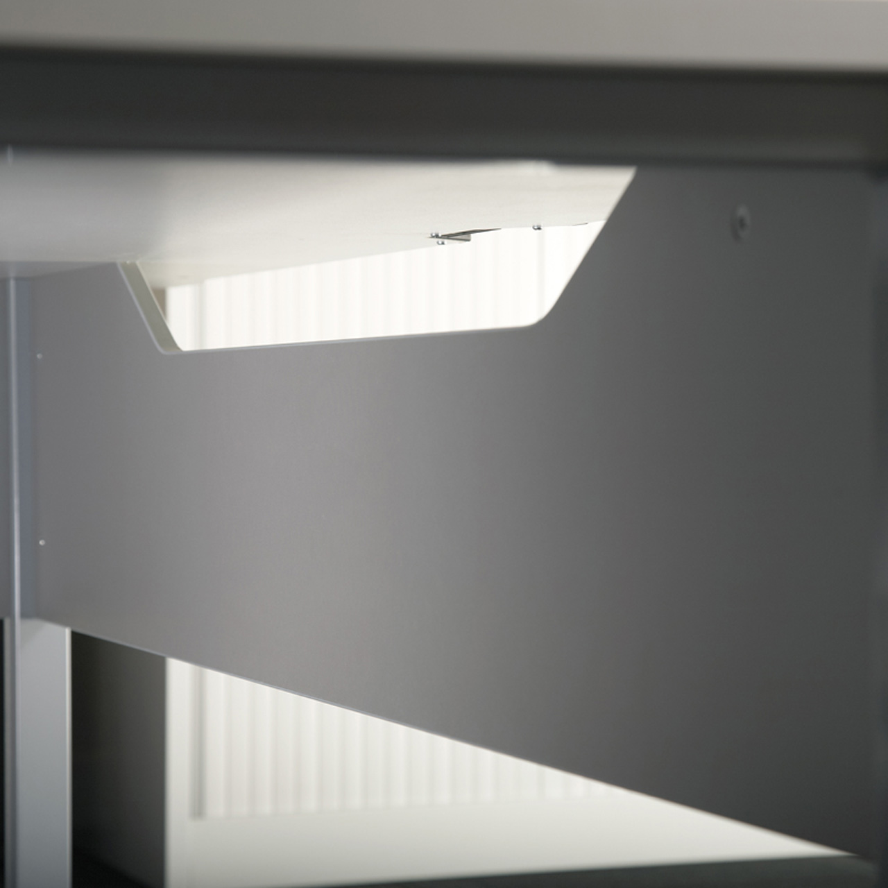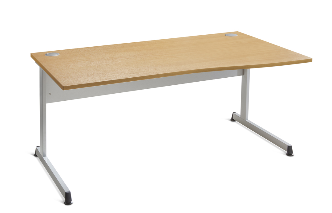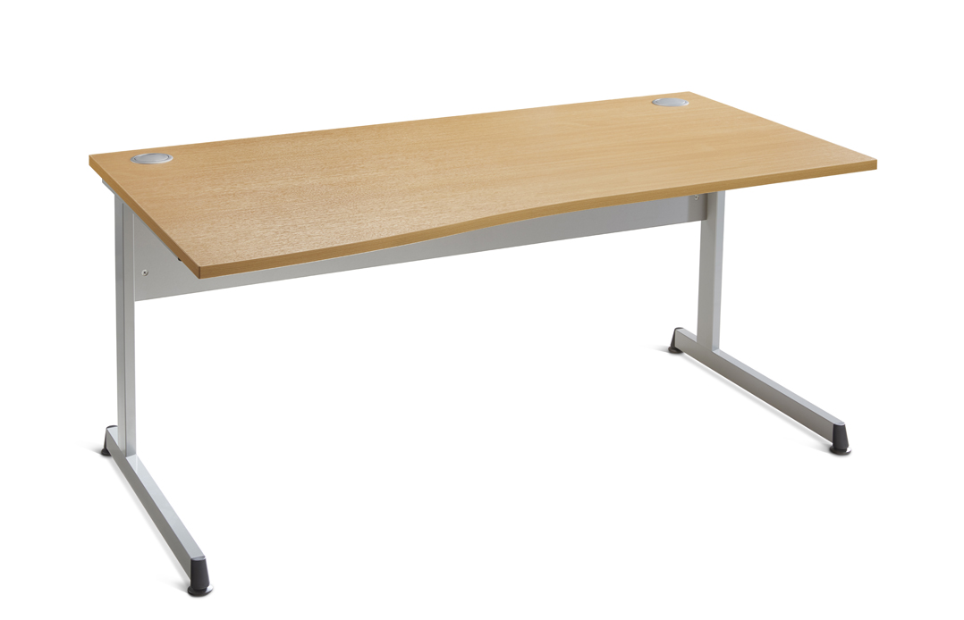 The Media Lite range of single wave desking, cantilever frame finished in Silver (RAL9006). Unique and stylish foot detail with height adjustment glide. 25mm MFC top with matching 2mm ABS edging. Top complete with two cable pods.