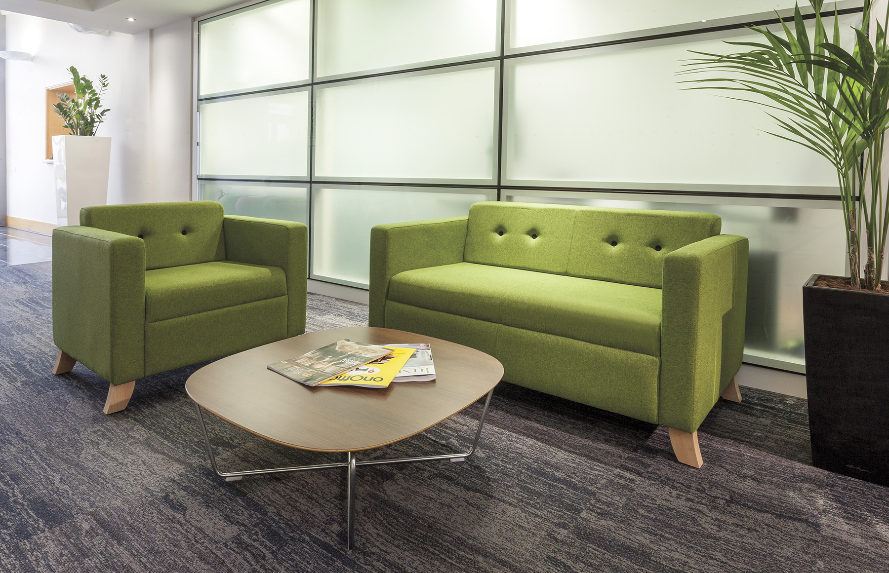 Upholstered sofas and armchair with steel underframe finished in satin silver (optional chrome underframe, optional air charge. Can be upholstered in either fabrics or vinyls