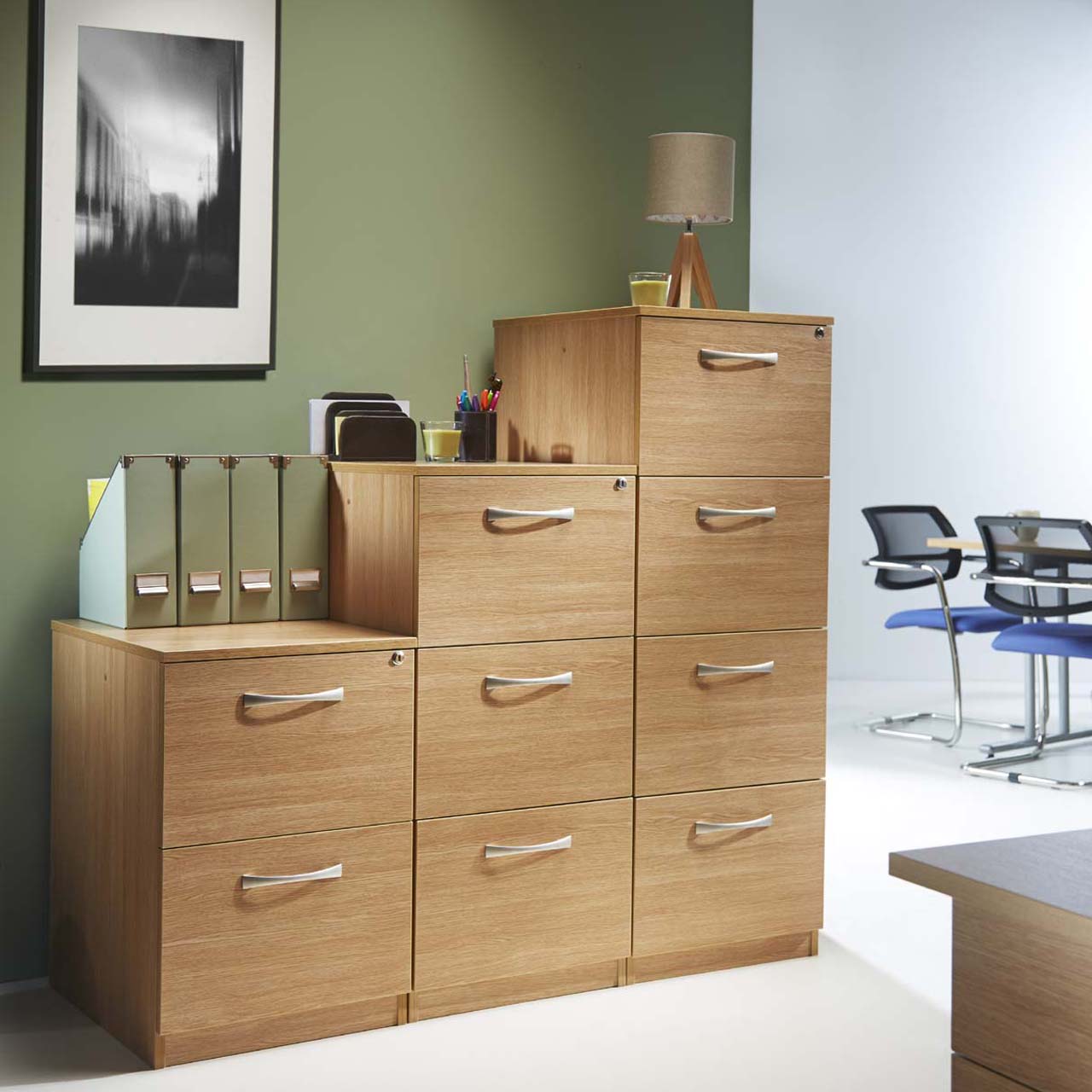 Wooden vertical filing cabinets, available in beech, oak or maple. Lockable.